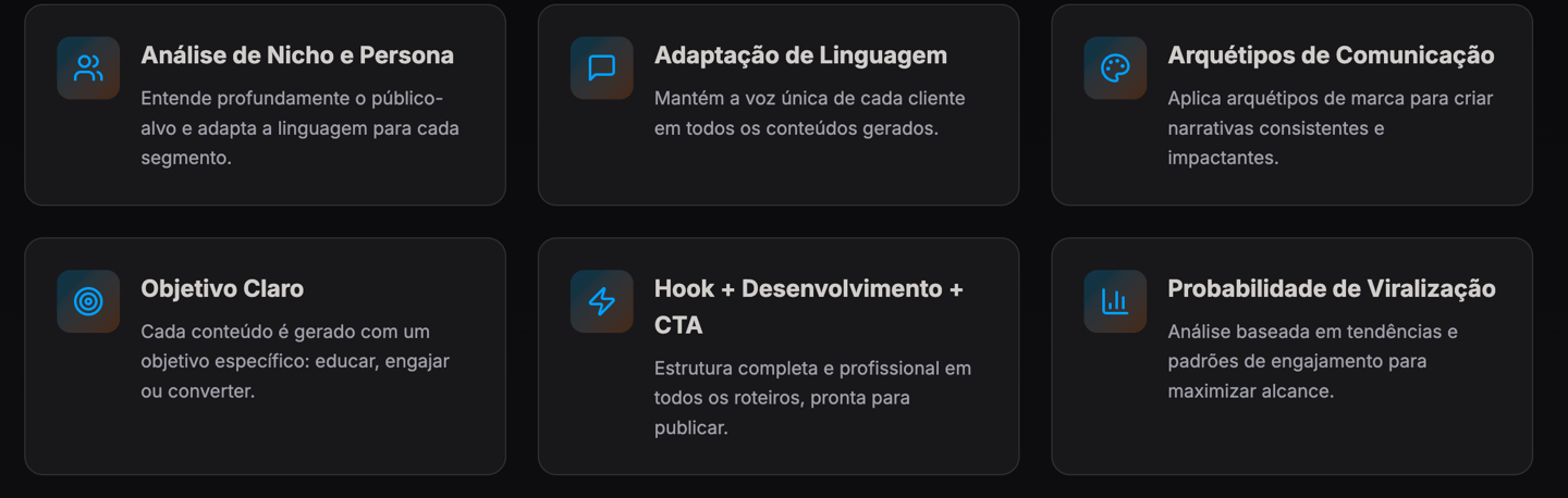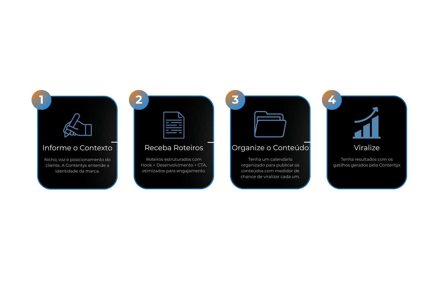 O Contentyx transforma briefing, branding e posicionamento e em roteiros prontos, estruturados para reter, engajar e crescer.